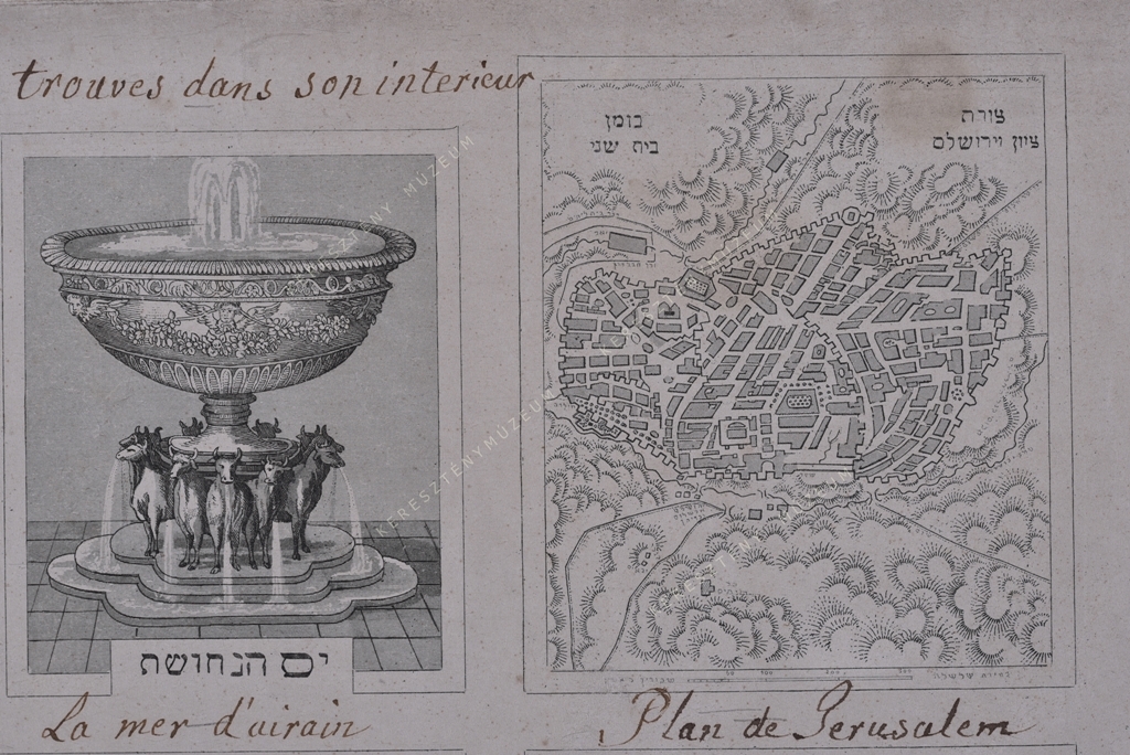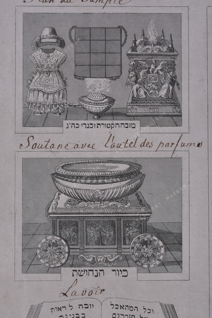 Az egyes képek alatt nyomtatott héber illetve kézírásos francia nyelvű felirat. (A franciában néhány hibával).