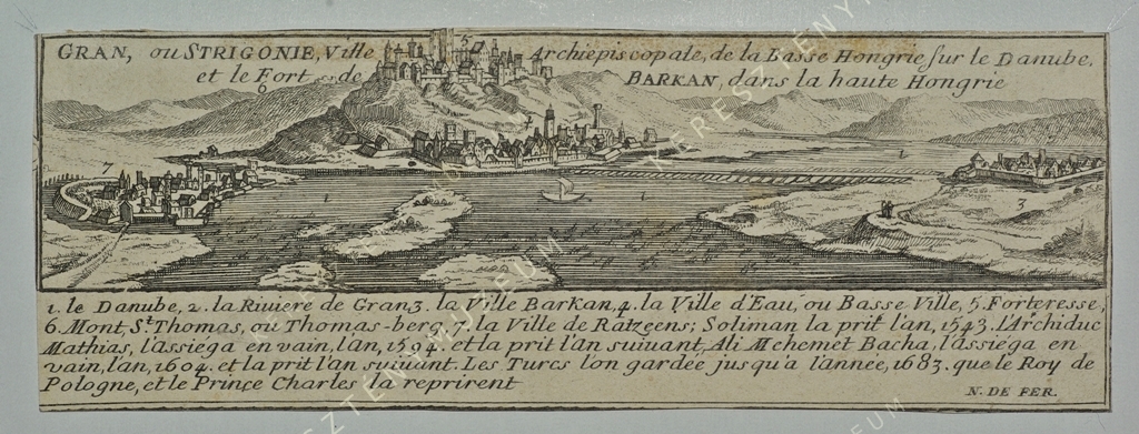 1. le Danube, 2. la riuiere de Gran […] 7. la Ville de Ratzeens; és rövid várostörténet: Soliman l'a prit l'ans 1543, l'Archiduc Mathias l'assiéga en vain […] Les Turcs l§on gardée jusqu'a l'année 1683, que le Roi de Pologne, et le Prince Charles la reprirent.