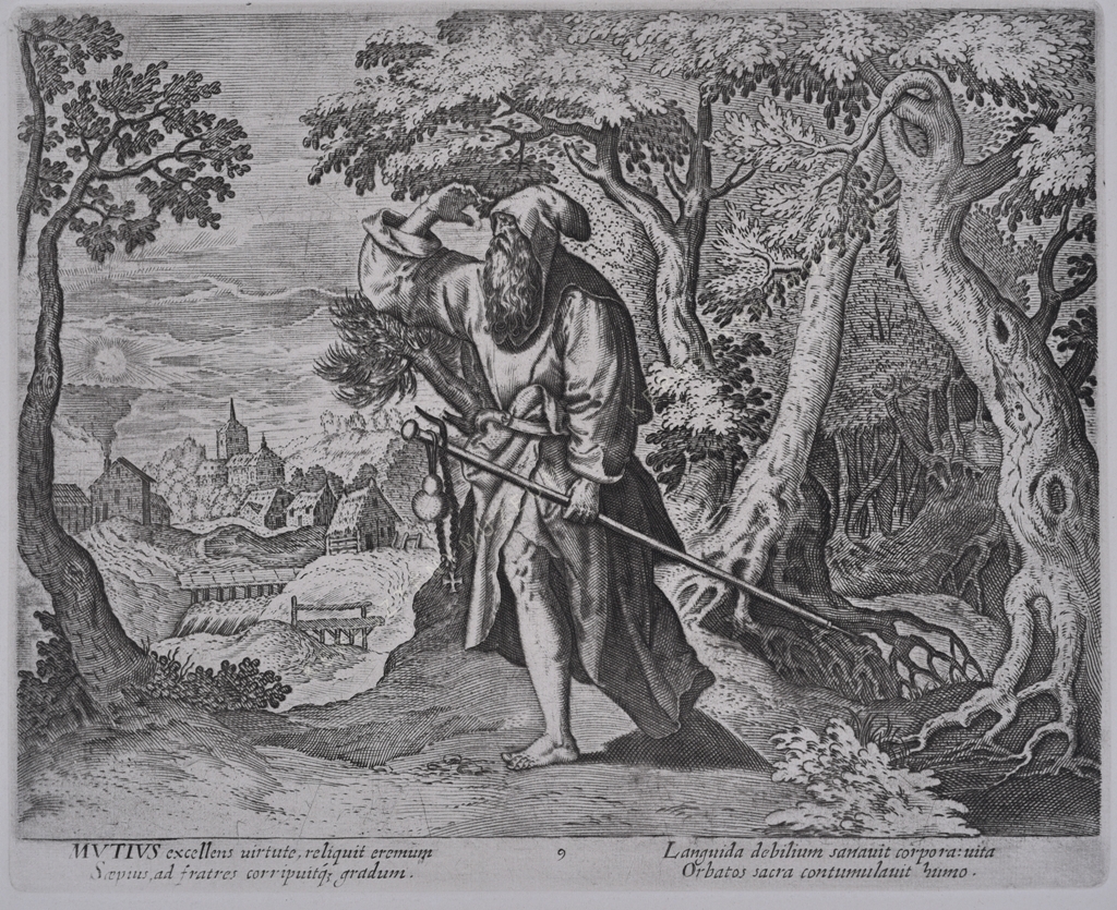 MVTIVS excellens uirtute, reliquit eremum Saepius, ad fratres corripuitque gradum. Languida debilium sanauit corpora: uita Orbatos sacra contumulauit humo.