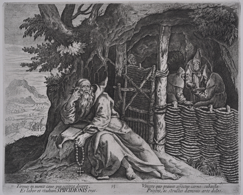 Tirones in monte cauo pia scripta docere, Et labor et studium SPIRIDIONIS erat. Vincere quo prauos affectus carne subacta Possent, ac structos daemonis arte dolos.