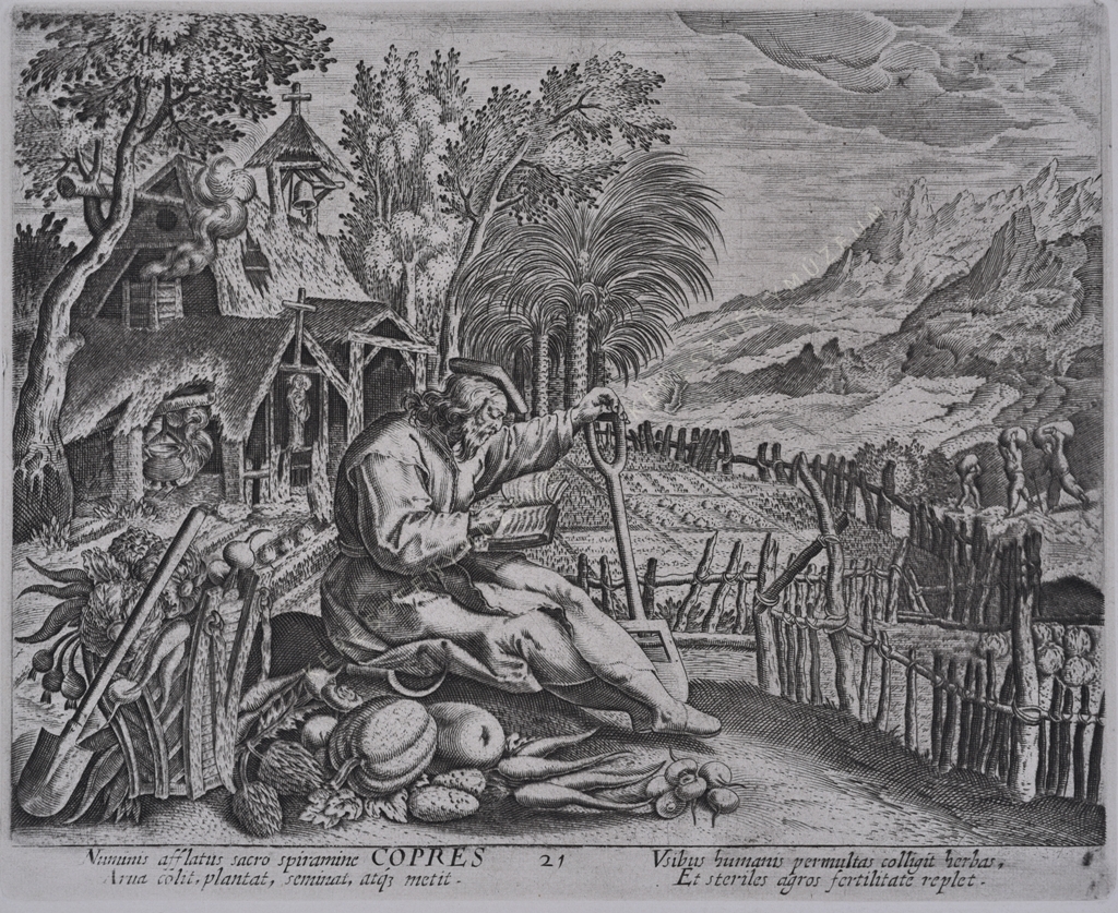Feliratok a kép alatt: Numinis afflatus sacro spiramine COPRES Arua colit, plantat, seminat, atqie metit. Vsibus humanis permultas colligit herbas, Et steriles agros fertilitate replet.