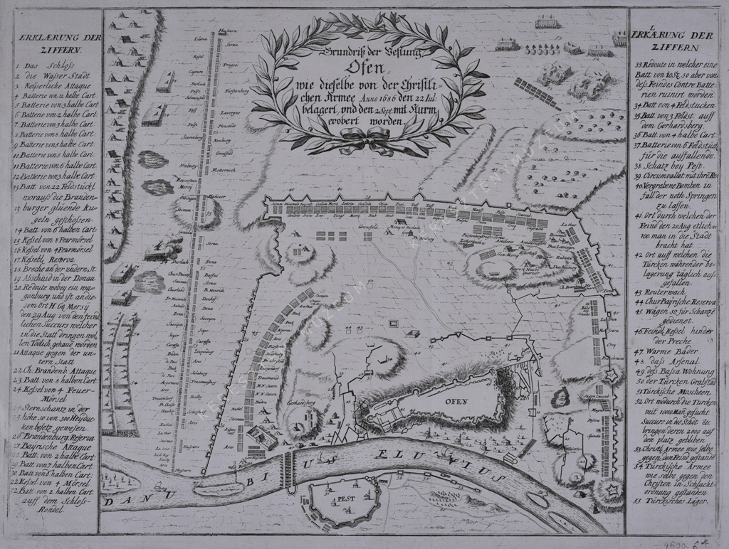 Grundriß der vestung OFEN, wie dieselbe von der Christlichen Armee Anno 1686 den 22 Iul: belagert, und den 2 Sept: mit Sturm erobert worden.