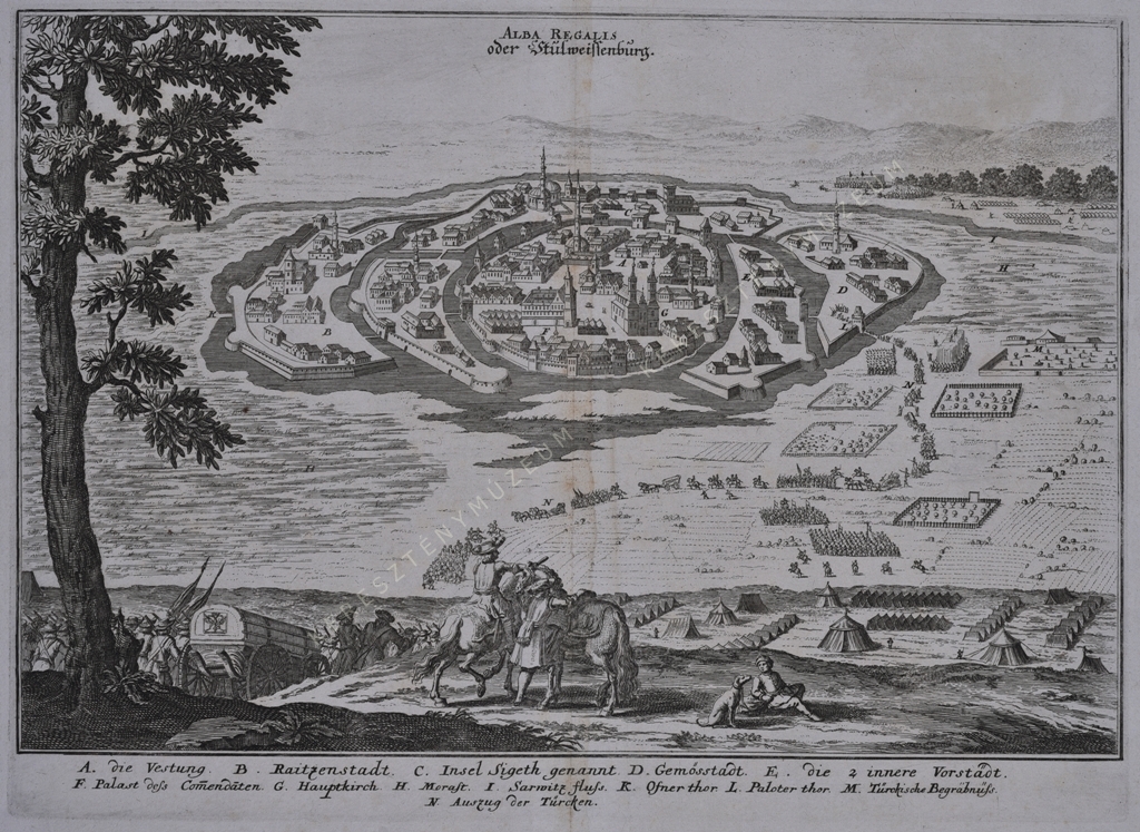 A. die Vestung. B. Raitzenstadt. C. Insel Sigeth genannt. D. Gemösstadt. E. die 2 innere Vorstädt. F. Palast dess Comendaten. G. Hauptkirch. H. Morast. I. Sarwitz fluss. K. Offner thor. L. Paloter thor. M. Türckische Begräbnüss. N. Auszug der Türcken.