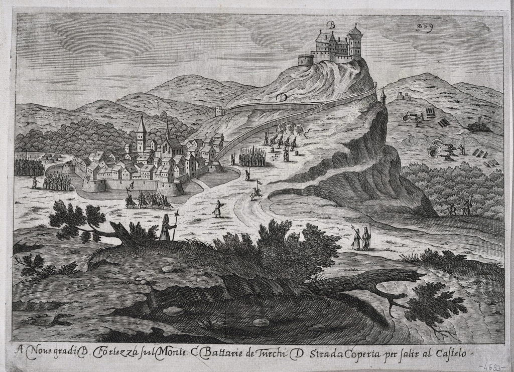 A. Nouegradi. B. Fortezza sul Monte. C. Battarie de Turchi. D. Strada Coperta per salir al Castelo.