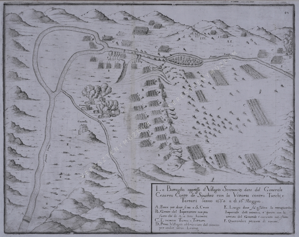 A. Ponte per doue si ua a S. Croce. B. Gente del Imperatore non piu forte che di c.a 3000 huomini. C. L' inimico Turco, e Tartaro. D. Primo Villaggio abbrucciato dal inimico per andar uerso Levenz. E. Luogo doue fu assalita la retroguardia Imperiale dall inimico, e questo con la uenuta del Generale e cacciato nel fiume. F. Quatordeci pezzetti di canone.