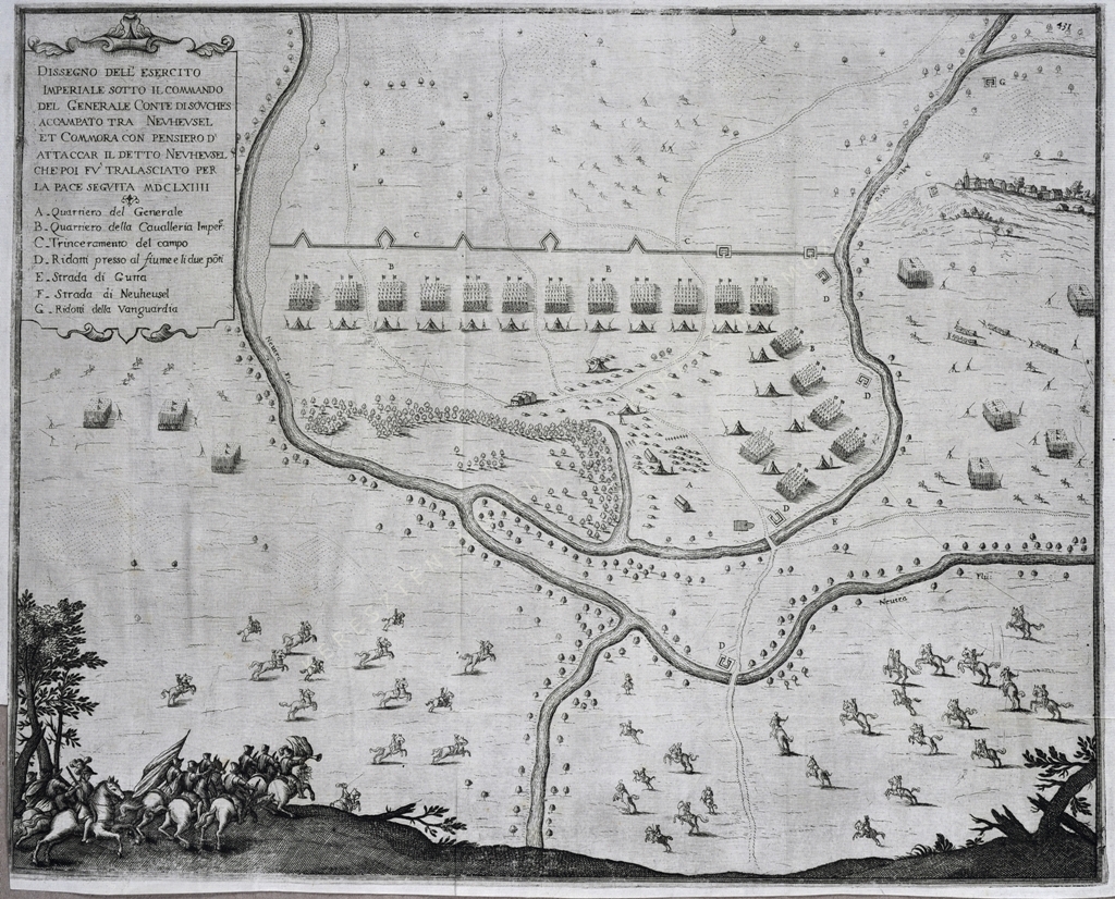DISSEGNO DELL' ESERCITO IMPERIALE SOTTO IL COMMANDO DEL GENERALE CONTE DI SOUCHES ACCAMPATO TRA NEVHEVSEL ET COMMORA CON PENSIERO D'ATTACCAR IL DETTO NEVHEVSEL CHE POI FV' TRALASCIATO PER LA PSCE SEGVUITA MDCLXIIII.