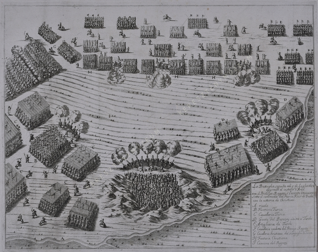 A il riuolo. B Fanteria Turca. C Caualleria Turca. D Gente del Barczay unita a Turchi. E Artiglieria de' Turchi. F Caualleria condotta dal Principe Ragozzi. G Caualleria christiana che scompiglia la Turca. H Fanteria Christiana. I Cannone del Ragozzi