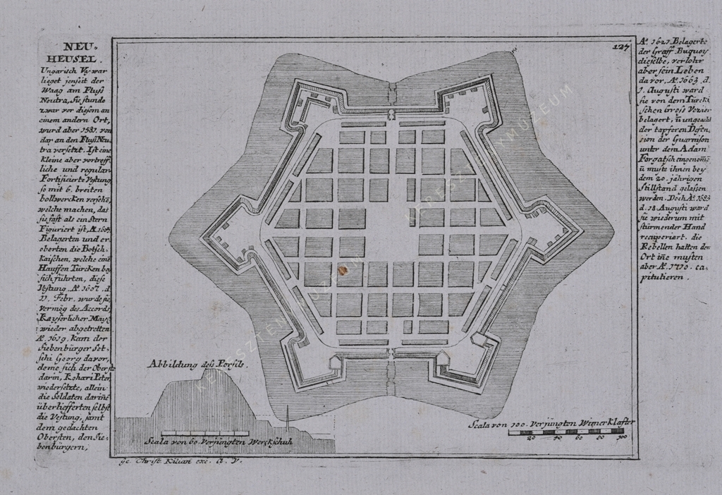 [...] Ungarisch Vyvar lieget jenseit der Waag am Fluß Neutra, Sie stunde zwar vor diesem an einem andern Ort, wurd aber 1581 von dar an den Fluß Neutra versetzt. Ist eine kleine aber vortreffliche und regular Fortificierte Vestung, so mit 6. breiten bollwercken versehe(n9. [...] Doch A.o 1683 d. 18 Augusti ward sie wiederum mit stürmender Hand recuperiert. die Rebellen halten den Ort in(n)e musten aber A.o 1710 capitulieren.
