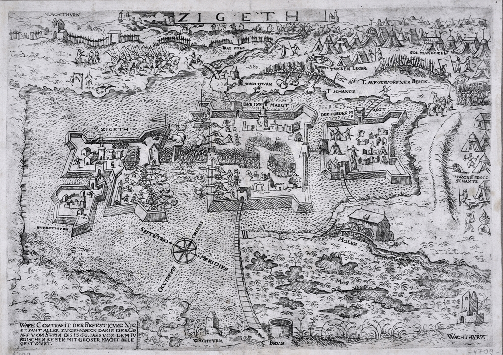 WARE CONTRAFIT DER BEFESTIGUNG ZIGET SAMT ALLER ZUGEHORICK DARIN DER GRAFF VON SERIN DIS. 1566 IARS VON DEM TURGISCHEN KEISER MIT GROSER MACHT BELEGERT WURT. Német nyelvű magyarázó feliratokkal.