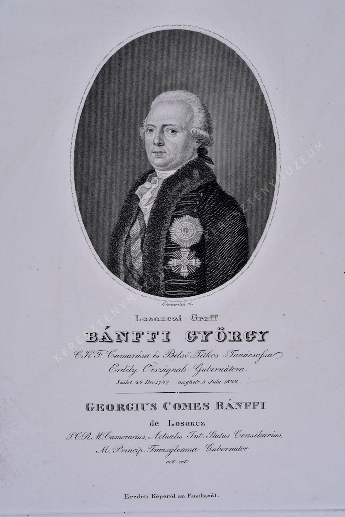 C.K.F. Kamarása és Belső Titkos Tanácsossa, Erdély Országnak Gubernátora. Szület. 24. Dec. 1747. Megholt 5. Julii 1822. / GEORGIUS COMES BÁNFFI de Losoncz S.C.R.M. Camerarius, Actualis Int. Status Consiliarius, M. princip. Transylvaniae Gubernator cet.cet.