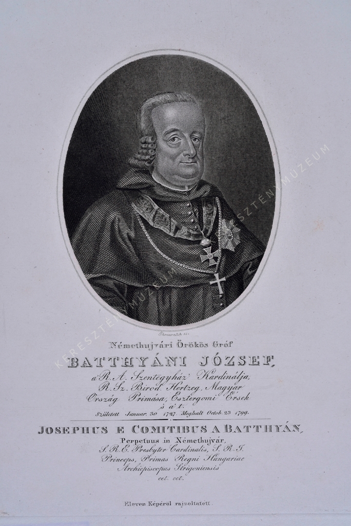 a R. A. Szentegyház' Kardinálja, R. Sz. Birod. Hertzeg, Magyar Ország Primása, Esztergomi Érsek, 's a' t. Született Januar 30. 1727. Meghalt octob. 23. 1799. / JOSEPHUS E COMITIBUS A BATTHYÁN, Perpetuus in Némethujvár, S.R.E. Presbyter Cardinalis, S.R.I. Princeps, Primas Regni Hungariae Archiepiscopus Strigoniensis cet. cet.