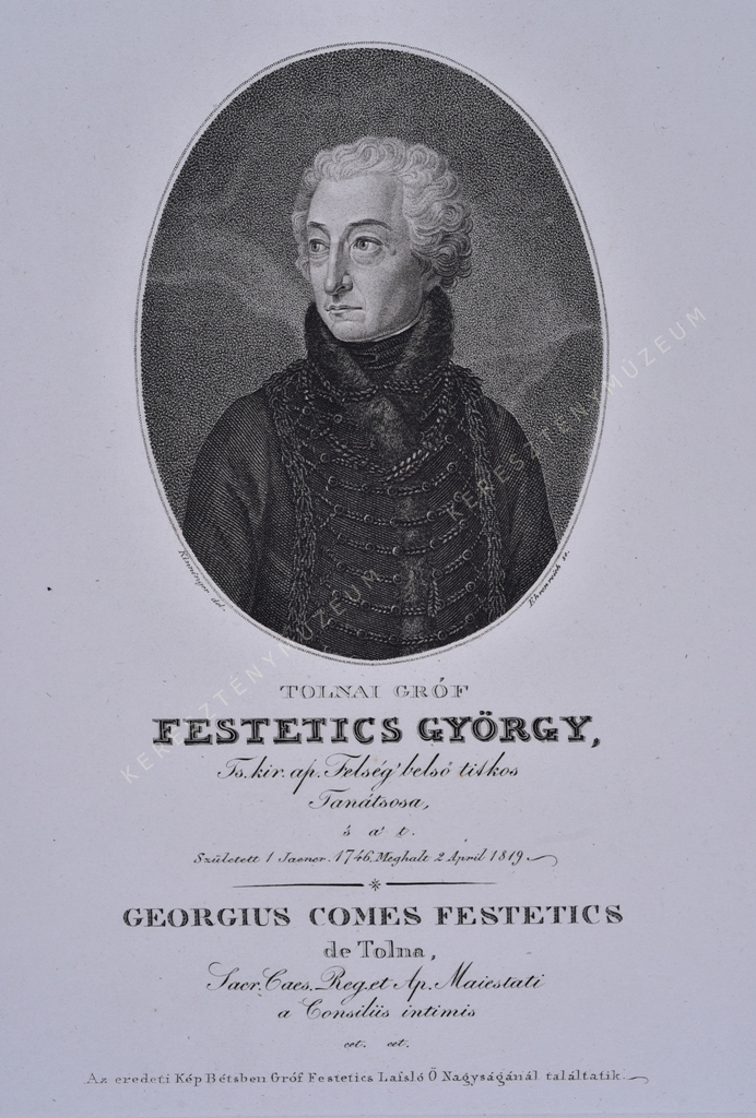 Ts. Kir. Ap. Felség' belső titkos Tanátsosa, 's a' t. Született 1 Jaener 1746. Meghalt 2 April 1819. / GEORGIUS COMES FESTETICS de Tolna, Sacr. Raeg. Et Ap. Maiestati a Consiliis intimis cet.cet.