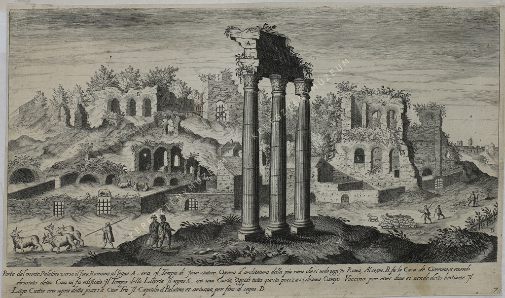 Parte del monte Palatino uerso il foro Romano al segno A. era il Tempio di Ioue statore Opera d'architettura della piu rara che si uede oggi in Roma, Al segno B fu la casa de Cicerone et essendo abrusiata detta Casa ui fu edificato il Tempio della Liberta. Il segno C era una Curia, oggidi tutta questa piazza si chiama Campo Vaccino per esser doue si uende detto bestiame Il Lago Curtio era sopra detta piazza Cioe Tra il Capitolio e l' Palatino et ariuaua fino al segno D.