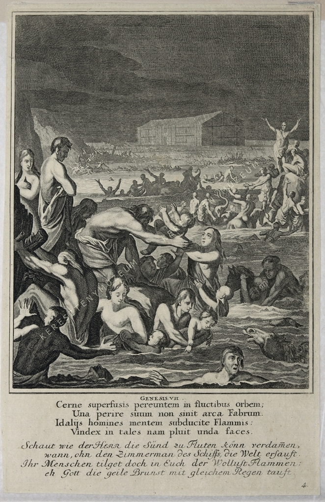 GENESIS VII. Cerne superfusis pereuntem in fluctibus orbem: / Una perire suum non sinit arca Fabrum. / Idalzs homines mentem subducite Flammis: / Vindex in tales nam pluit unda faces. // Schaut wie der HERR die Sünd zu Fluten könn verdam(m)en, / wann, ohn den Zimmermann des Schiffs, die Welt ersauft. / Ihr menschen tilget doch in Euch der Wollust Flammen: / eh Gott die geile Brunst mit gleichem Regen tauft. | jobb alsó sarokban oldalszám: 4.
