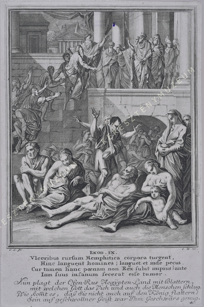 EXOD. IX. Vlceribus rursum Memphitica corpora turgent, / Hinc languent homines; languet et inde pecus. / Cur tamen hanc poenam non Rex subit impius? ante / Iam suus insanum fecerat esse tumor. // Nun plagt der Ofen-Rus Aegypten-Land mit Blattern, / mit welchen Gott das Vieh und auch die Menschen schlug. / Wie kom(m)t es, daß sie nicht auch auf den König flattern? / Sein auf geschwollner Geist war Ihm Geschwärs genug. | lent jobbra oldalszám: 40.