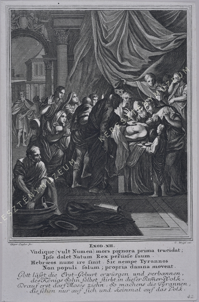 EXOD XII. Vndique (vult Numen) mors pignora prima trucidat; / Ipse dolet Natum Rex periisque suum. / Hebraeos nunc ire finit. Sic nempe Tyrannos / Non populi solum; propria damna movent. // Gott lässt die Erst-Geburt erwürgen und verbannen / des Königs Sohn selbst stirbt, in dieser Iam(m)er-Wolk. / Drauf erst darf Moses ziehn. So machens die Tyrannen, / die sehen nur auf sich und keinmal auf das Volk. | jobbra lent oldalszám: 42.