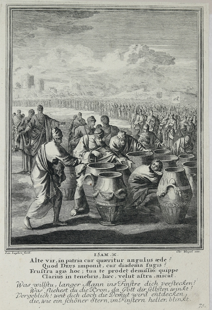 I. SAM. X. Alta vir, in patria cur quaeritur angulus aede? / Quod DEUS imponit, cur diadema fugis? / Frustra agis hoc; tua te prodet demissio: quippe / Clarius in tenebris, haec, velut astra, micat. // Was willstu, langer Mann ins Finstre dich verstecken? / Was fliehest du die Kron, da Gott dir selbsten winkt? / Vergeblich! weil dich doch die Demut wird entdecken, / die, wie ein schöner Stern, im Finster heller, blinkt. |lent jobbra oldalszám: 75