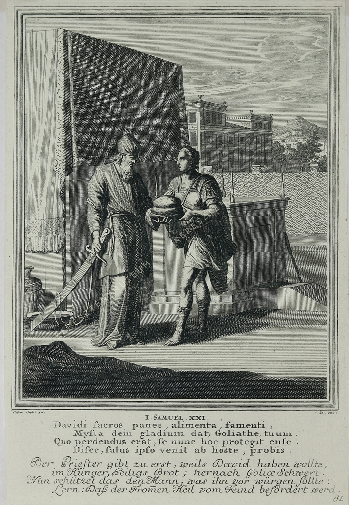 I. SAMUEL XXI. Davidi sacros panes, alimenta, famenti, / Mysta dein gladium dat, Goliathe, tuum. / Quo perdendus erat, se nunc hoc protegit ense. / Disce, salus ipso venit ab hoste, probis. // Der Priester gibt zu erst, weils David haben wollte, / im Hunger, heiligs Brot; hernach Goliae Schwert. / Nun schützet das den Mann, was ihn vor würgen sollte: / Lern: Daß der From(m)en Heil vom Feind befördert werd. | jobbra lent oldalszám: 81