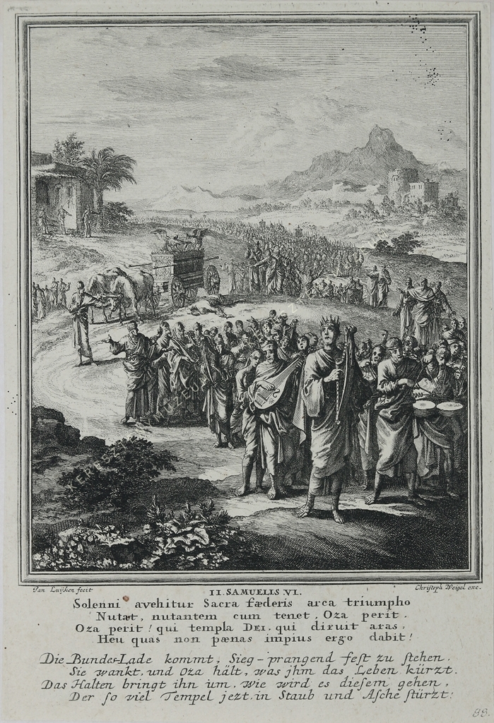 II. SAMVELIS VI. Solenni avehitur Sacra faederis arca triumpho / Nutat, nutantem cum tenet, Oza perit. / Oza perit! Qui templa DEI, qui diruit aras, / Heu quas non paenas impius ergo dabit! // Die Bundes-Lade kommt, Sieg-prangend fest zu stehen. / Sie wankt, und Oza hält, was ihm das Leben kürzt. / Das Halten bringt ihn um, wie wird es diesem gehen, / Der so viel Tempel jezt in Staub und Asche stürzt. | jobbra lent oldalszám: 88