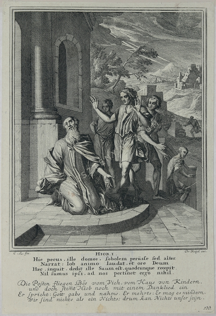 HIOB. I. Hic pecus, ille domos, sobolem periisse sed alter / Narrat: Iob animo laudat, et ore Deum. / Haec, inquit, dedit ille suum est, quodcunque recepit. / Nil sumus ipsi, ad nos pertinet ergo nihil. // Die Posten fliegen Bös vom Vieh, vom Haus von Kindern, / und doch stim(m)t Hiob noch mit einem Danklied ein / Er spricht: Gott gabs und nahms. Er mehrts: Er mag es mindern. / Wir sind nichts als ein Nichts; drum kan Nichts unser seyn. | jobbra lent: 133