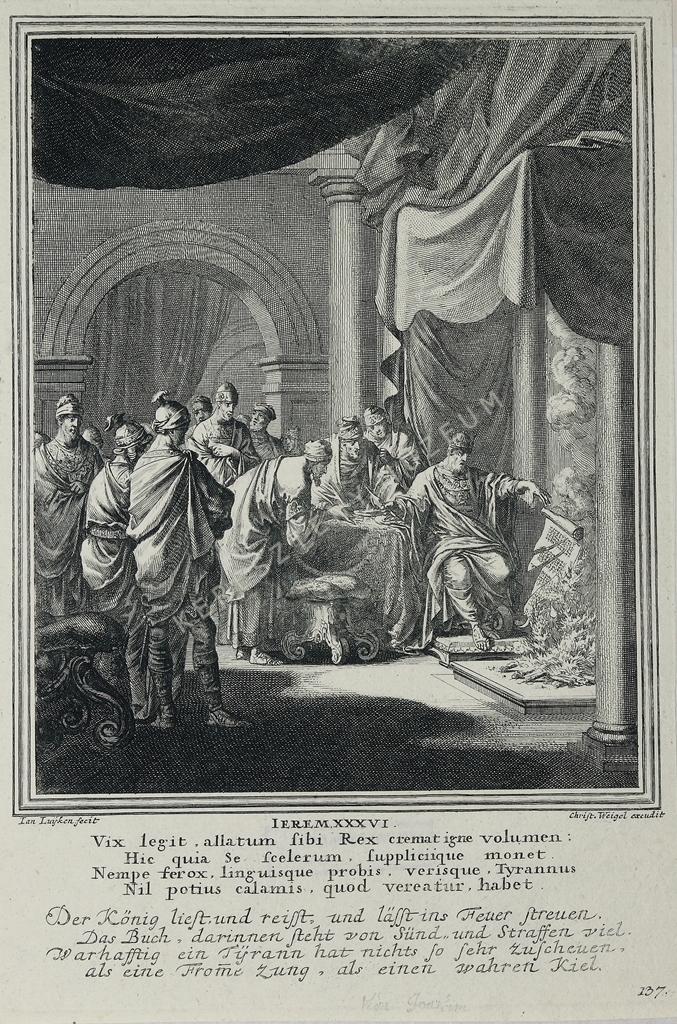IEREM. XXXVI. Vix legit, allatum sibi Rex cremat igne volumen: / Hic quia Se scelerum, suppliciique monet. / Nempe ferox, linguisque probis, verisque Tyrannus / Nil potius calamis, qoud vereatur, habet. // Der König liest, und reisst, und lässt ins Feuer streuen, / Das Buch, darinnen steht von Sünd, und Straffen viel. / Warhafftig ein Tyrann hat nichts so sehr zuscheuen, / als eine From(m)e zung, als einen wahren Kiel. | jobbra lent oldalszám: 137
