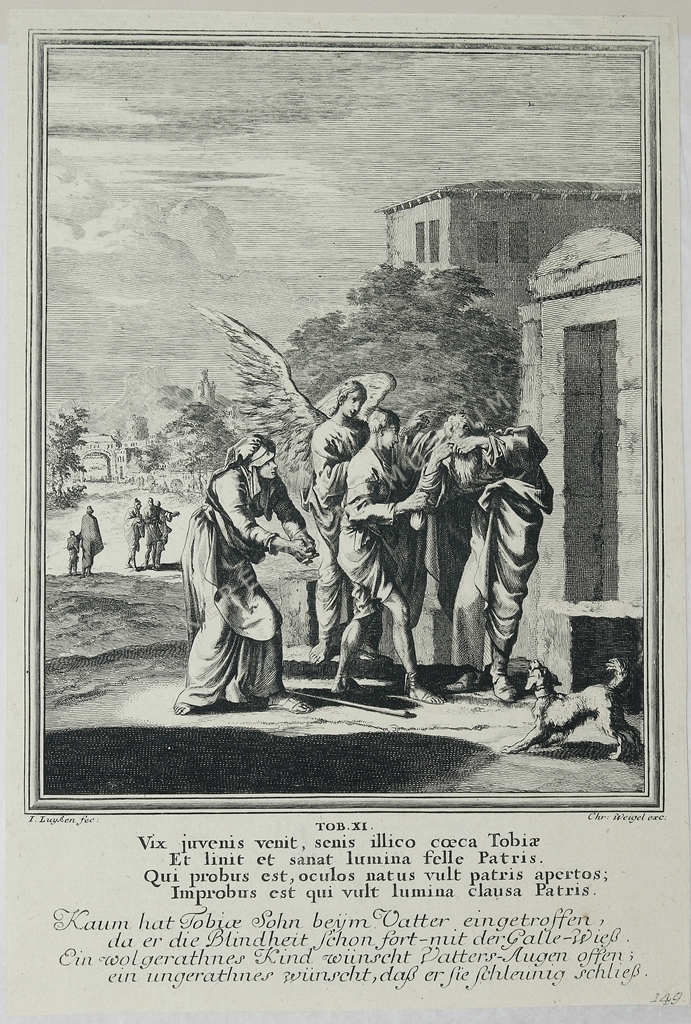TOB. XI: Vix juvenis venit, senis illico coeca Tobiae / Et linit et sanat lumina felle Patris. / Qui probus est, oculos natus vult patris apertos; / Improbus est qui vult lumina clausa Patris. // Kaum hat Tobiae Sohn beym Vatter eingetroffen, / da er die Blindheit schon fort - mit der Galle - Wieß. / Ein wolgerathnes Kind wünscht Vatters-Augen offen, / ein ungerathnes wünscht, daß er sie schleunig schließ. | jobbra lent oldalszám: 149