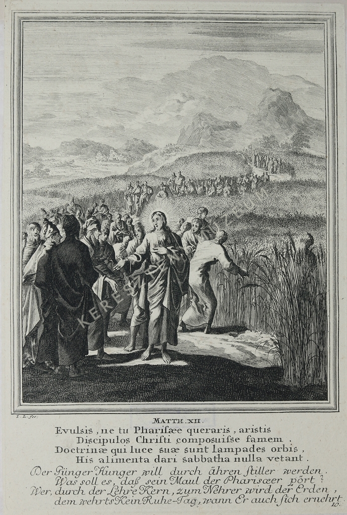 MATTH XII. Evulsis, ne tu Pharisaee queraris, aristis / Discipulos Christi composuisse famem: / Doctrinae qui luce suae sunt lampades orbis, / His alimenta dari sabbatha nulla vetant. // Der Jünger Hunger will durch ähren stiller werden. / Was soll es, daß sein Maul der Pharisaeer pört? / Wer, durch der Lehre Kern, zum Nehrer wird der Erden, / dem wehrts Kein Ruhe-Tag, wann Er auch sich ernehrt. | jobbra lent oldalszám: 10