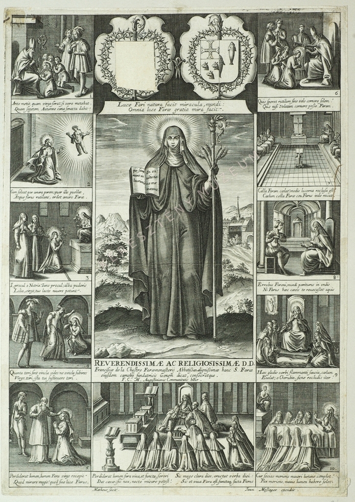 Reverendissimae ac religiosissimae D. D. Franciscae de la Chastre Faraemonasterij Abbatißae dignißimae hanc S. Farae eiusdem coenobij fundatricis iconem dicat, consecratque. F. C. M. Augustianus Communitatis bitur.