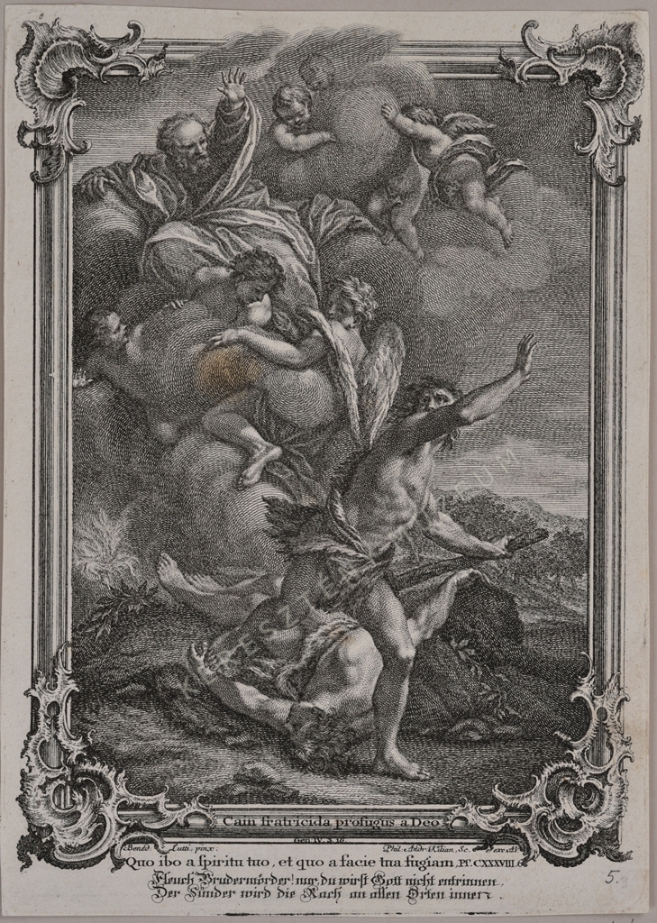 Cain fratricida profugus Deo. Gen. IV. 3. 16. Quo ibo a spiritu tuo, et quo a facie tua fugiam, Ps. CXXXVIII. 6. Fleuch Brudermoerder! Nur, du wirst Gott nicht entrinnen, Der Sünder wird die Rach an allen Orten innen. | Ceruzával: 5.