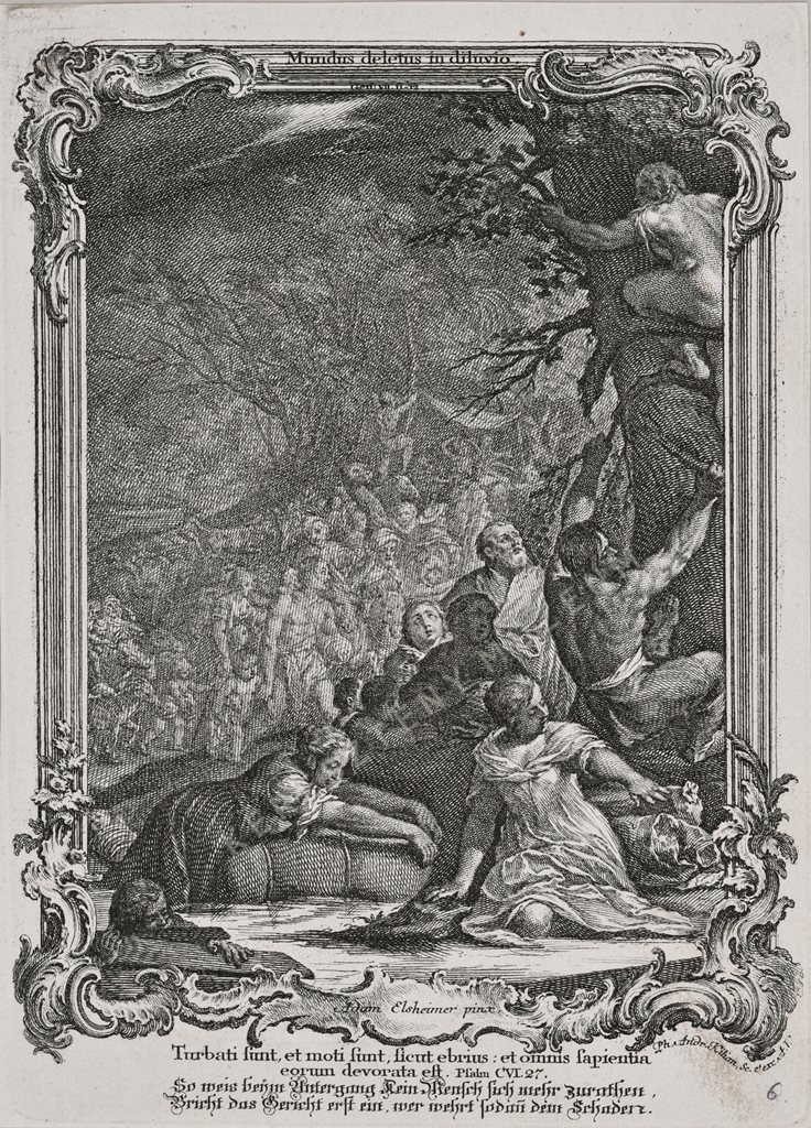 Mundus deletus in diluvio. Gen: VII. 11-12. Turbati sunt, et moti sunt, sicut ebrius: et omnis sapientia eorum devorata est. Psalm. CVI. 27. So weys beim Untergang Kein Mensch sich mehr zurathen, Bricht das Gericht erst ein, wer wehrt sodan(n) dem Schaden. | Ceruzával: 6
