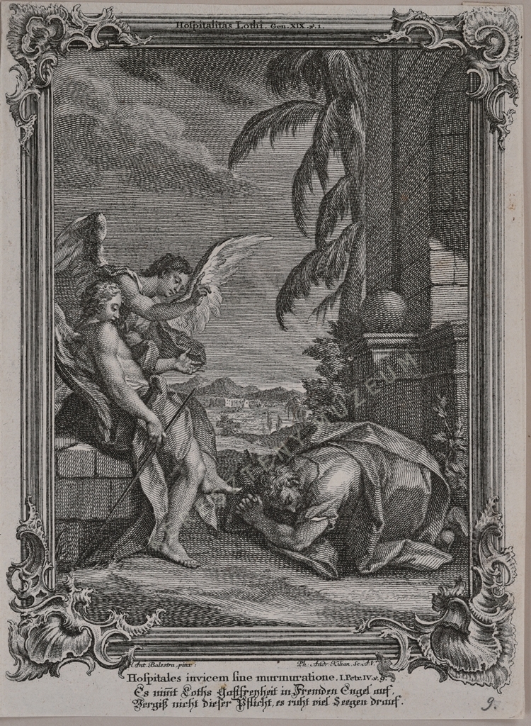 Hospitalitas Lothi. Gen. XIX. v. 1. Hospitales invicem sine murmuratione. I. Petr. IV. v. 9. Es nim(m)t Loths Gastfreyheit in Fremden Engel auf, Vergiß nicht dieser Pflicht, es ruht viel Seegen drauf. |Ceruzával: 9.