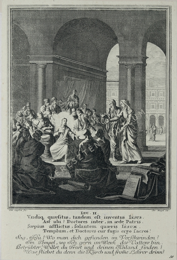 LUC. II. Vndique quaesitus, tandem est inventus Iesus, / Ast ubi? Doctores inter, in aede Patris. / Saepius afflictus, solantem quaerit Iesum. / Templum, et Doctores cur fugis ergo sacros? // Sag, Jesu! Wo man dich gefunden im Verschwinden? / Im Tempel, wo ich gern im Werk des Vatters bin. / Betrübter! Willst du Trost und deinen Heiland finden? / Was fliehst du denn die Kyrch und from(m)e Lehrer drinn? | jobbra lent képszám: 56
