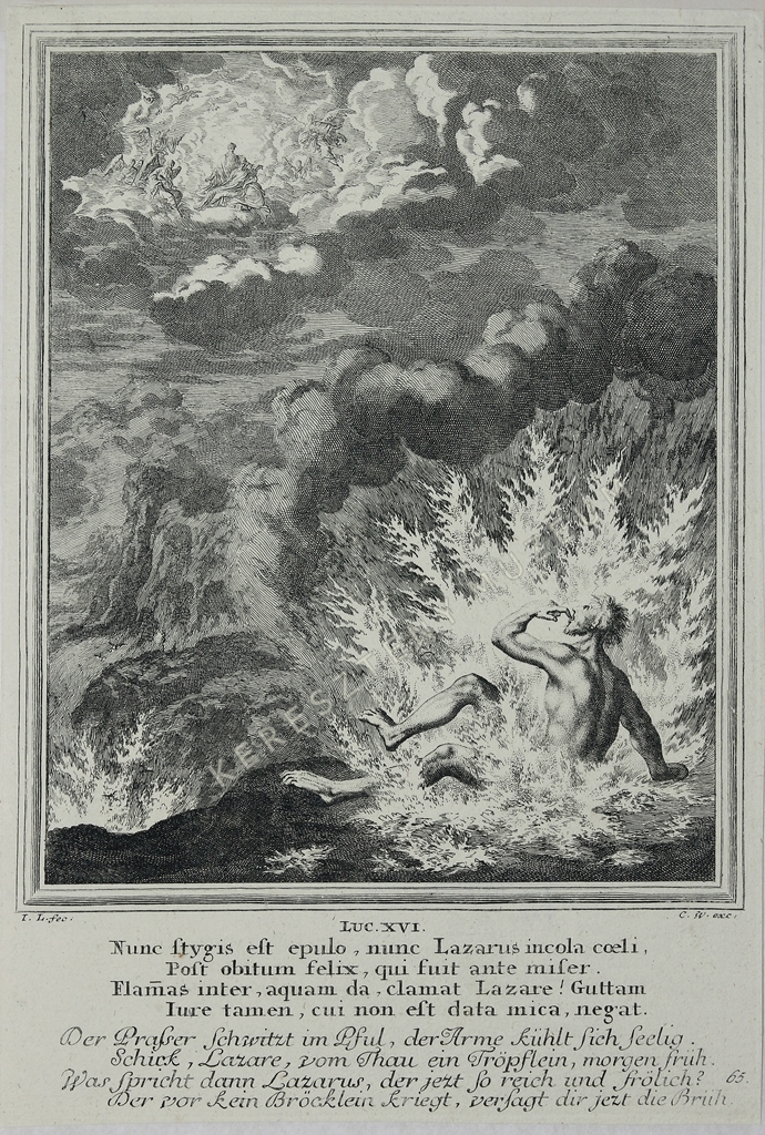 LUC. XVI. Nunc Stygis est epulo, nunc Lazarus incola coeli, / Post obitum felix, qui fuit ante miser. / Flam(m)as inter, aquam da, clamat Lazare! Guttam / Iure tamen, cui non est data mica, negat. // Der Praßer schwitz in Pful, der Arme kühlt sich seelig. / Schick, Lazare, vom Thau ein Tröpflein, morgen früh. / Was spricht dann Lazarus, der jezt so reich und frölich? / Der vor kein Bröcklein kriegt, versagt dir jezt die Brüh. | jobbra lent képszám: 65