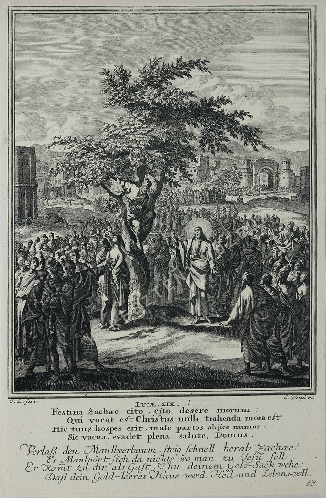 LUCAE XIX. Festina Zachae cito, cito desere morum: / Qui vocat est Christus: nulla trahenda mora est. / Hic tuus hospes erit, male partos abjice numos: / Sic vacua, evadet plena salute, Domus. // Verlaß den Maulbeerbaum, steig schnell herab, Zachaee! / Es Maulpört sich da nichts, wo man zu Iesu soll. / Er kom(m)t zu dir, als Gast. Thu deinem Geld-Sack wehe! / Daß dein Gold-leeres Haus werd Heil und Lebens-voll. | jobbra lent képszám: 68