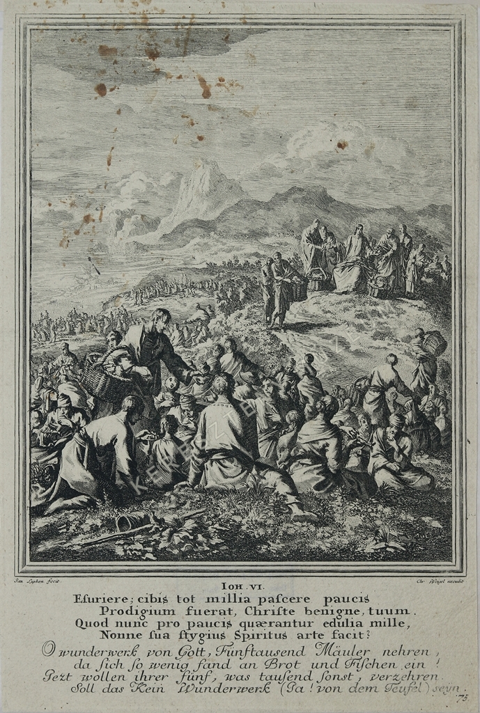 IOH. VI. Esuriere; cibis tot millia pascere paucis / Prodigium fuerat, Christe benigne tuum. / Quod nunc pro paucis quaerantur edulia mille, / Nonne sua stygius Spiritus arte facit? | jobbra lent képszám: 75