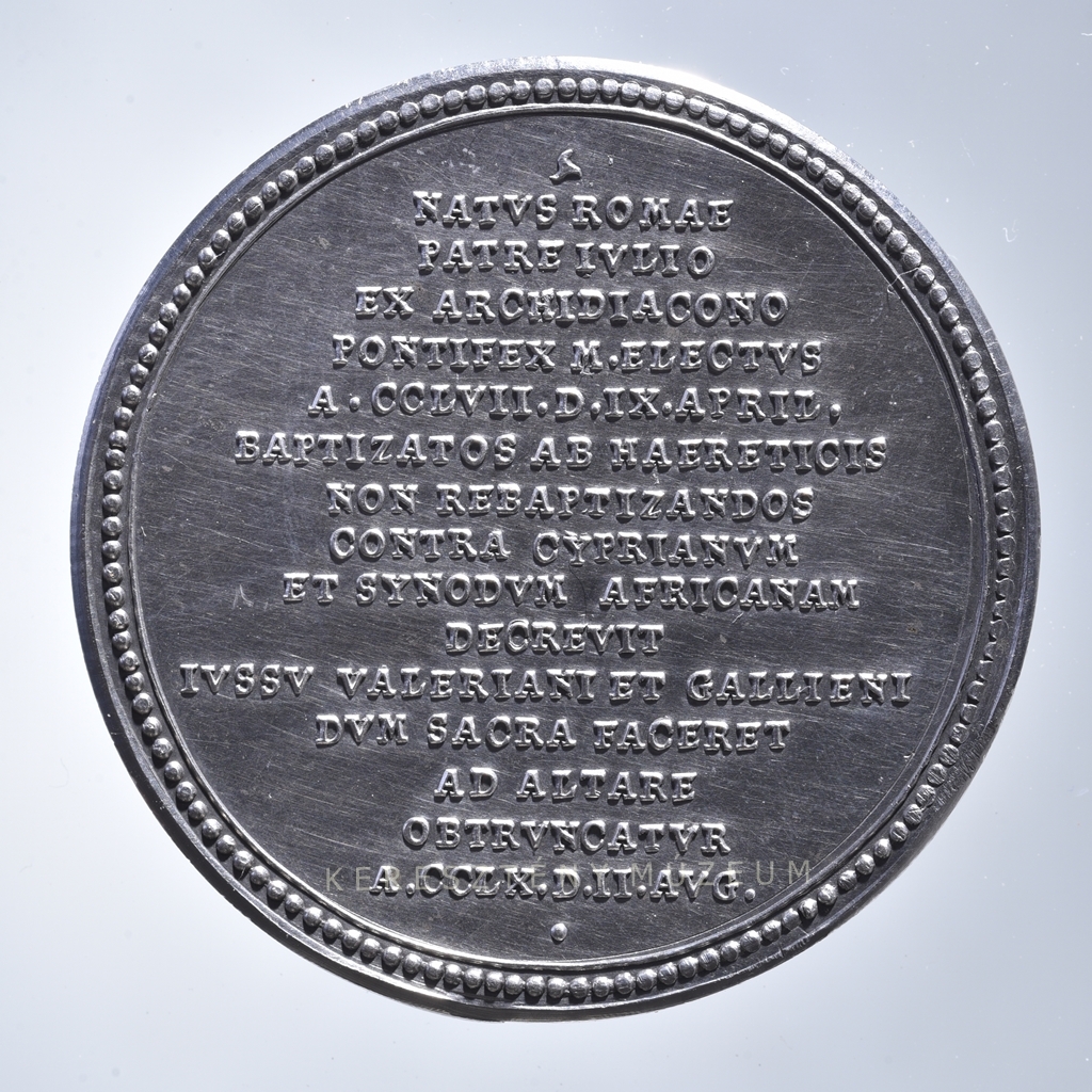 Körirat: S*STEPHANUS*I*PONT*MAX | NATVS ROMAE PATRE IVLIO EX ARCHIDIACONO PONTIFEX M*ELECTVS*A*CCLVII*D*IX*APRIL*BAPTIZATOS AB HAERETICIS NON REBAPTIZANDOS CONTRA CYPRIANVM ET SYNODVM AFRICANAM DECREVIT IVSSV VALERIANI ET GALLIENI DVM SACRA FACERET AD ALTARE OBTRVNCATVR A.CCLX.D.II.AVG.*