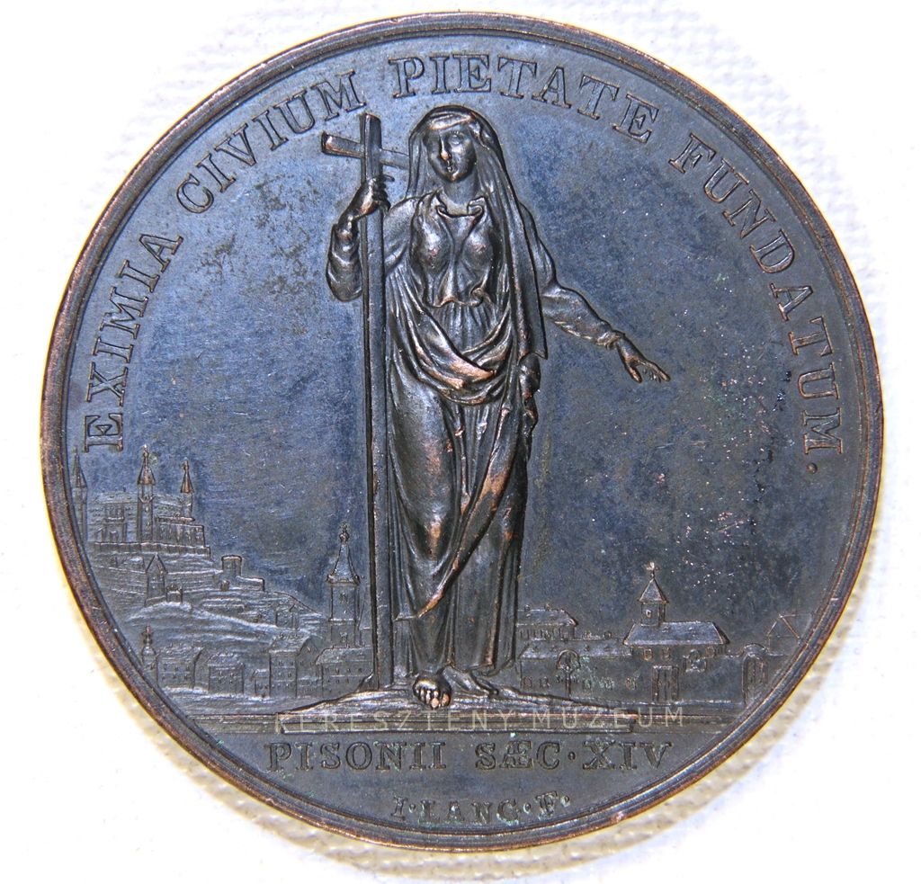Előlap:Szemben álló , jobbjában keresztet tartó, baljában a mögötte levő épületre mutató fátyolos, hosszú ruhás nőalak. Balra lent Pozsony látképe.