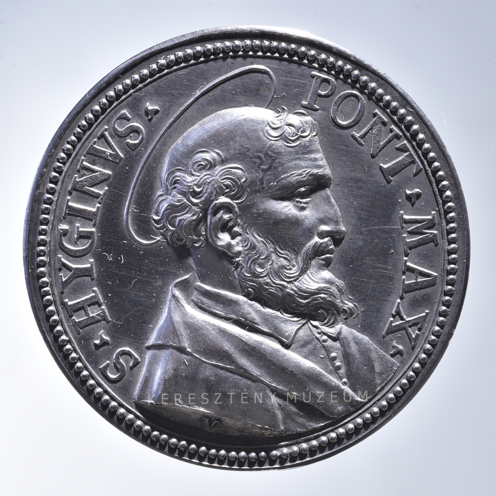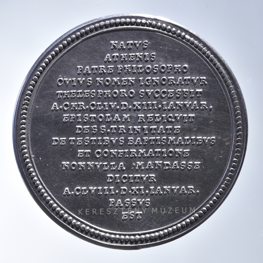 Előlap: S • HIGINVS • PONT • MAX • |Hátlap: NATVS |ATHENIS |PATRE PHILOSOPHO |OVIVS NOMEN IGNORATVR |THELESPHORO SVCCESSIT |A.CHR•CLIV•D.XIII.IANVAR. |EPISTOLAM RELQVIT |DES S.TRINITATE |DE TESTIBVS BAPTISMALIBVS |ET CONFIRMATIONE NONNVLLA MANDASSE |DICITVR |A.CLVIII.D.XI.IANVAR. |PASSUS |EST
