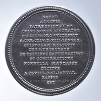 Sima perem, gyöngysoros gyűrűvel. Előlap: a pápa mellképe jobb nézetből. Vállán köpeny, feje fedetlen, felette aureola. Hátlap: rövid életrajz, 15 soros latin szövegben, középre rendezve.