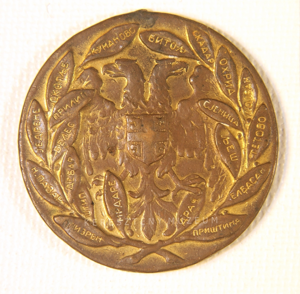 Hátlap: Szerb kétfejű sasos címer, babérkoszorúban, a leveleken a Szerbiához csatolt balkáni települések neveivel (Pristina, Kumanovo, Ohrid, Debar, stb.)