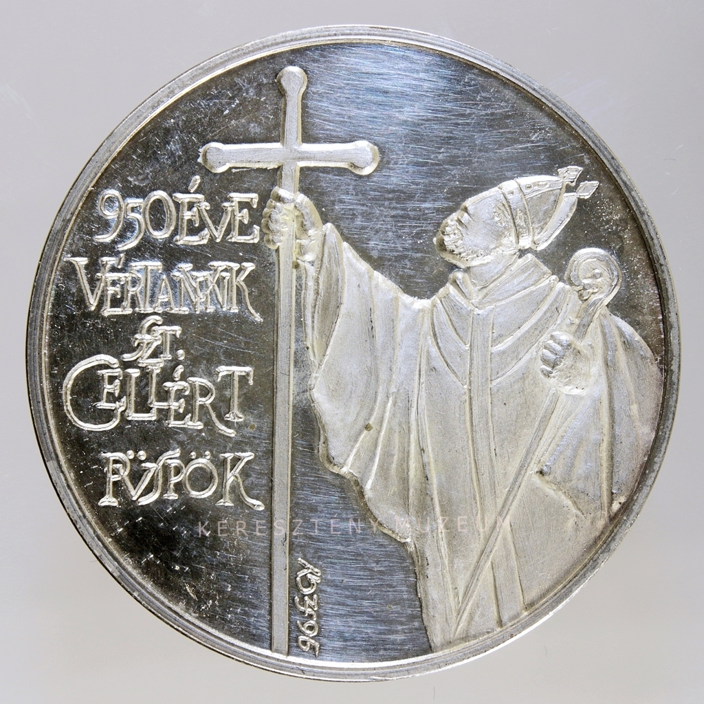 Előlap: A szent püspök álló alakja, egyik kezében pásztorbot, a másikkal keresztet tart magasba