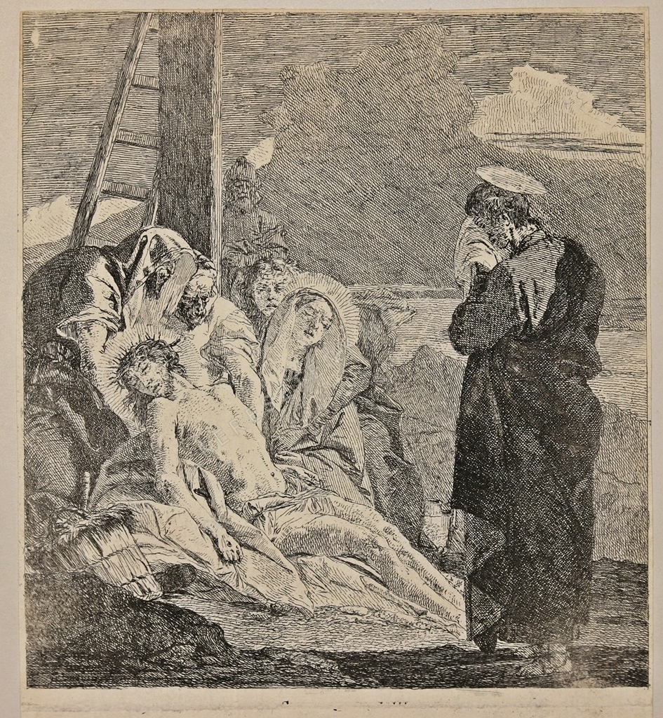 [STAZIONE XIII. MORTO GESÙ VIEN DEPOSTO DALLA CROCE IN SENO SUA SS.A MADRE / Spira del Padre in sen l'Alma adorata / Gesú: resta a Maria la Spoglia amata.]