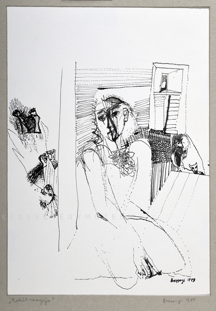 Az előtérben térdelő, elrévedő alak, hátterében tyúkketrec, alatta két róka