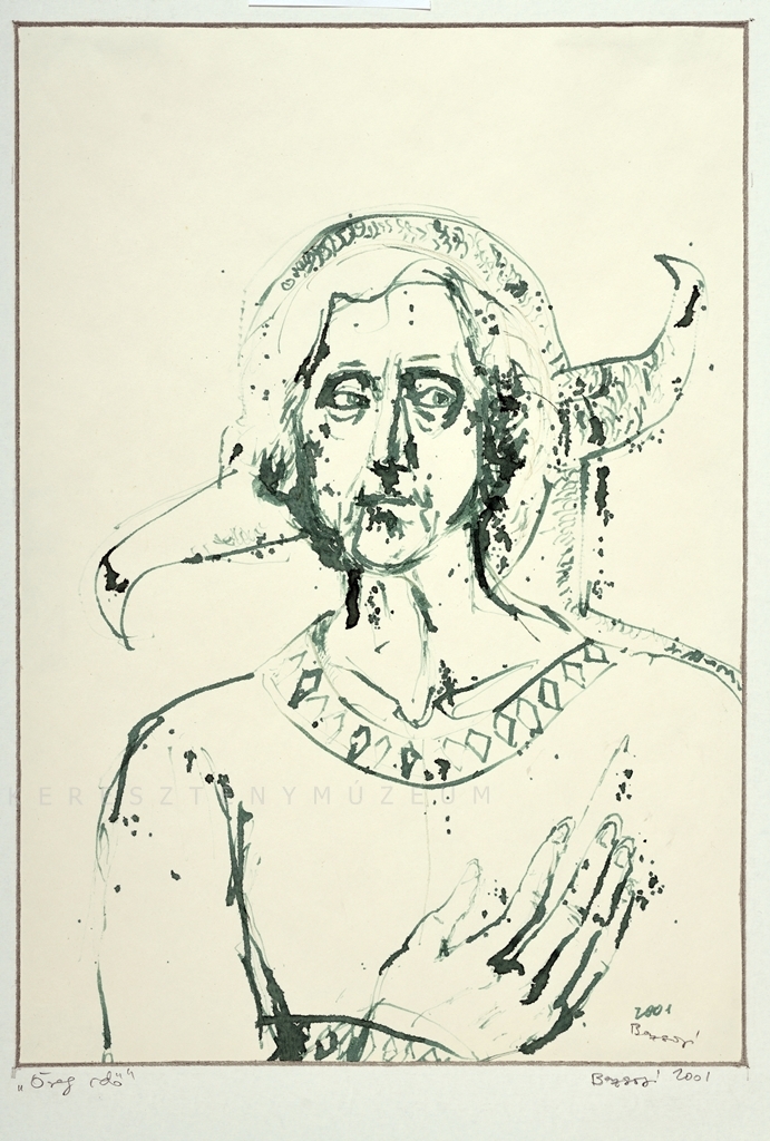 Frontálisan ábrázolt alak mellképe, jobb keze mellkasa előtt. Fejének két oldalán ellentétes irányba kanyarodó szerv (?). Önarckép (felirat a passzpartún). Zöld tus.