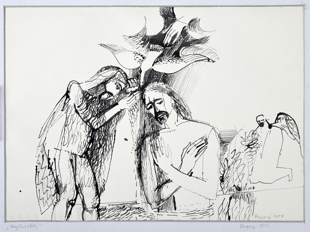 Krisztus derékig a Jordánban elmerült alakjától jobbra Keresztelő Szent János áll, felemelt kezével éppen a vizet hinti. Fölöttük a Szentlélek galambja, és az Atyai kéz.