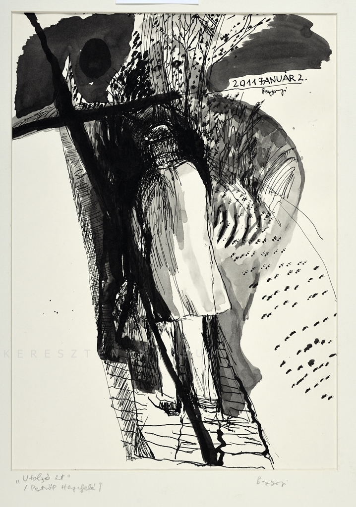 Távolodó, kockaköves úton haladó alak, mögötte kereszt.