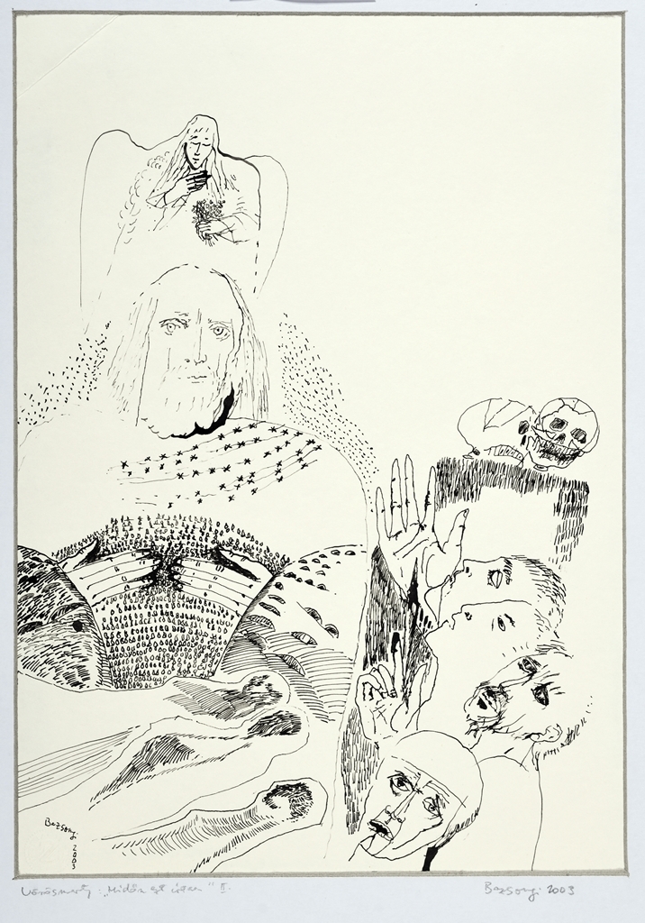 Krisztus arcú, mellkasán szögesdrótot vieselő alak fölött virágcsokrot tartó angyal.