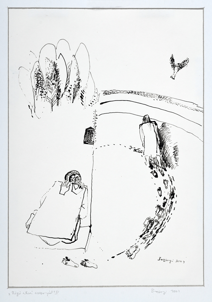 A bal alsó sarokban térdelő alak, jobbra mezítlábas, hajlott hátú nő halad az úton egy erdő irányába.