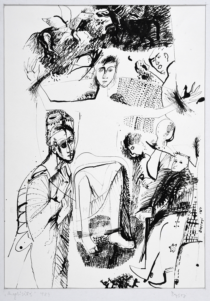 Középen mintegy trónon ülő, kezeit széttáró alak, mezítelen lábai összekötözve. Előtte emberek, mögötte szárnyas lovak és egy öklét rázó férfi