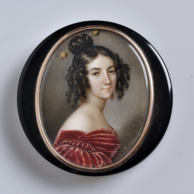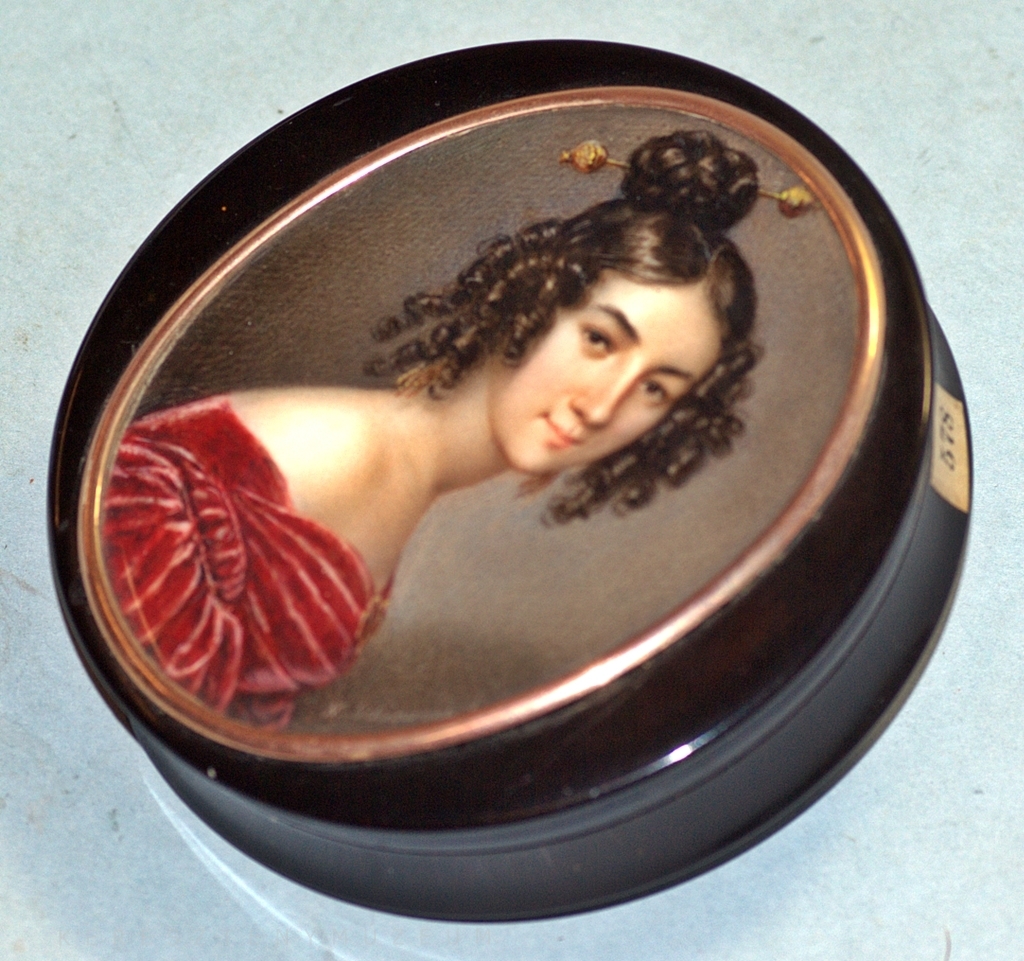 Két, kerek, fél-darabból álló dobozka fedőlapján ovális, fém keretben, pergamenre festett, fiatal nő mellképe.
